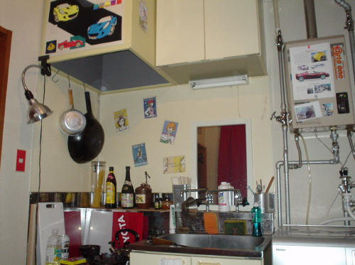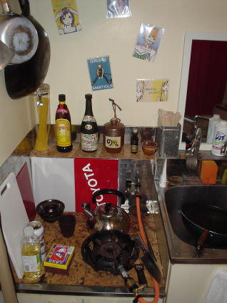 左の図、キッチンの状態はほとんど変わっていません。下にも写真がありますが、コンロがカセットコンロから業務用になったのと